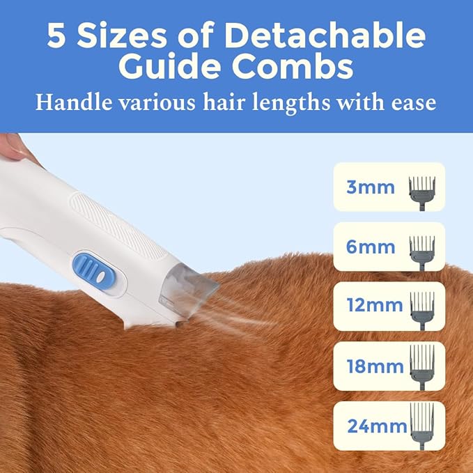 - 【5 Grooming Accessories】Includes an attachment organizer for tool organization, five detachable guide combs for customized styling, and four versatile vacuum attachments—Electronic Clipper, Slicker Brush, Dusting Brush, and Crevice Tool—for a thorough and efficient grooming experience