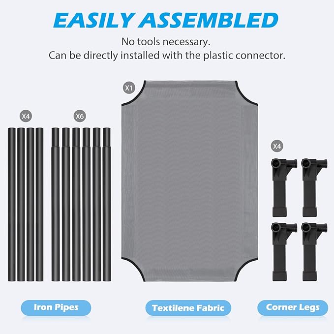 - Easy to Install: The cooling dog cot can be installed without the use of any tools, screws and can be installed directly with the plastic connector. It only takes a few minutes of your time, and presto! It's up and ready for your pet to enjoy in.