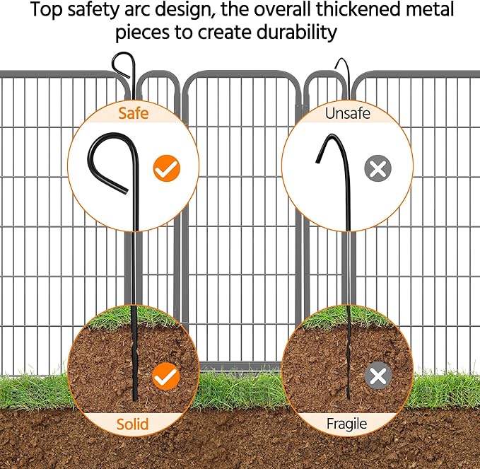 - Solid Metal Stakes Ensuring Safety: The upgraded solid metal stakes achieve a fully enclosed bend, avoiding sharp edges and ensuring your animals play safely. At the same time, the solid stakes are easily inserted into the ground to keep the walls more stable and rigid when the dogs exercise