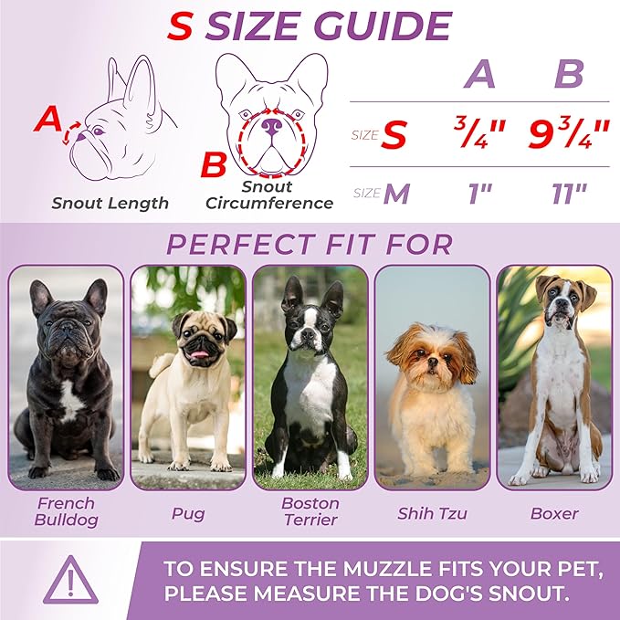 - S / M Sizes Available: Dog muzzle for french bulldog specifically designed for dogs with short snouts, ensuring a comfortable and secure fit. S size pug muzzle for snout length ¾" and girth 9¾".