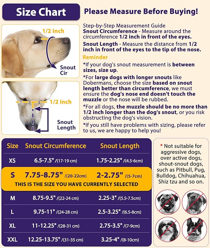 - Dog Muzzle for Small Dogs-Size S is suitable for snout circumference between 7¾"-8¾", and snout length longer than 2". The dog muzzle small breed is suitable for Beagle and Corgi and so on. Please measures twice before buying. If you have any problems with our small dog muzzles to prevent biting, we will do our best to help you.