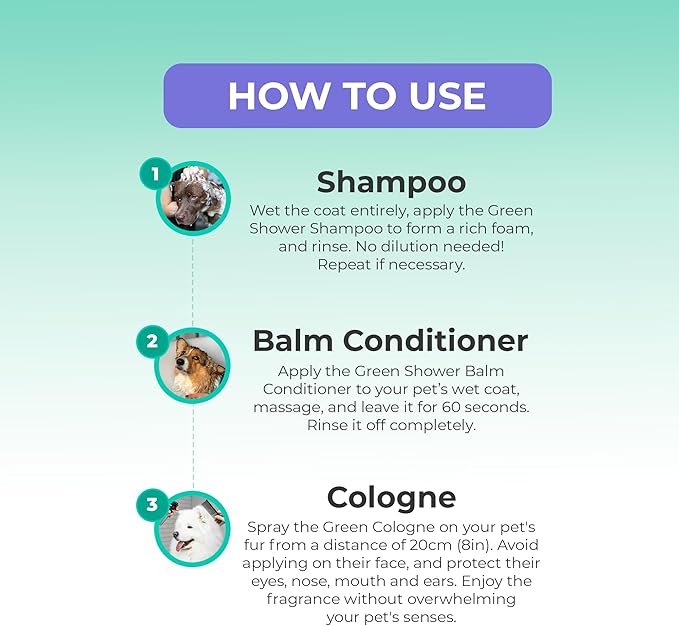 - 【USAGE INSTRUCTIONS】 After rinsing the Green Shower Shampoo, apply a small amount of the balm to your hands and spread it along the animal’s coat. Massage to distribute the product and let it act for 60 seconds. Rinse to remove the balm conditioner. Available in a 300ml / 10oz size of tender care for your cherished companion.