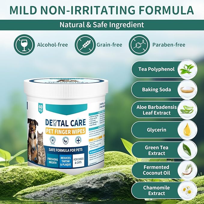 - GENTLE & NON-IRRITATING : We offer ingredients derived from purely natural sources, our dog toothbrush finger wipes gentle and friendly to pets, good for cleaning teeth and gums of dogs and cats. No alcohol, parabens and fragrance. It is safe to lick or ingest.