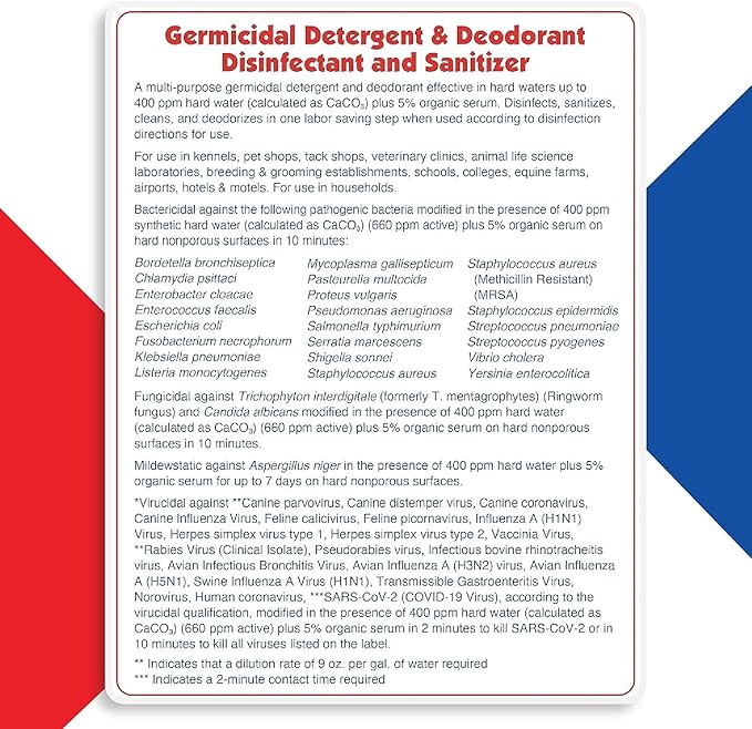 - Trusted quality - Our vet-formulated, EPA-registered disinfectant fights against staph infection, E.coli, and Canine Parvovirus, helping reduce outbreaks, and keeping facilities open.