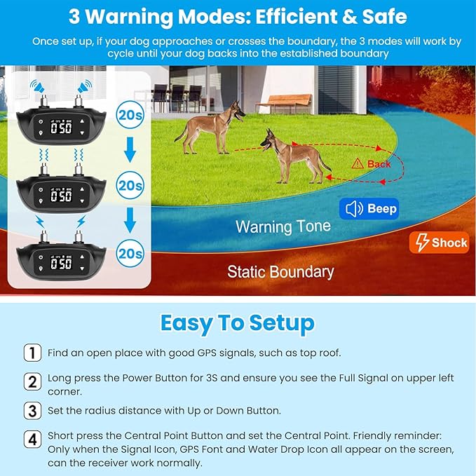 - GREAT DOG FENCE: Once your dog walks out of the boundary, the GPS receiver will beep for 20S, vibrate for 20S and give static shock for 20S. The beep, vibration and shock mode will work by cycle until your dog backs into the established boundary
