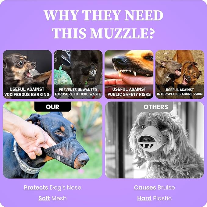 - ✅ GENTLE ON DOGS: Crafted from premium mesh, our dog soft muzzle offers both softness and durability, ensuring longevity. The enhanced ultra-breathable design guarantees optimal airflow, promoting your dog's comfort. Additionally, the plush padding shields your dog's nose from rubbing, providing utmost skin-friendliness. Experience superior comfort and resilience for your beloved pet.