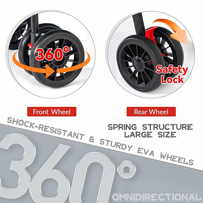 - 【Shock Absorbing Wheels】The wheels of the stroller are equipped with springs, which can effectively reduce vibration and reduce pet discomfort. The diameter of the wheels is 6 inches, and the oversized wheels can reduce the impact of stones and other objects on the ground. When carrying pets outdoors, it will make them feel smoother, more comfortable, and more secure. At the same time, the wheels also have universal wheels and safety lock functions, making travel more convenient and safe