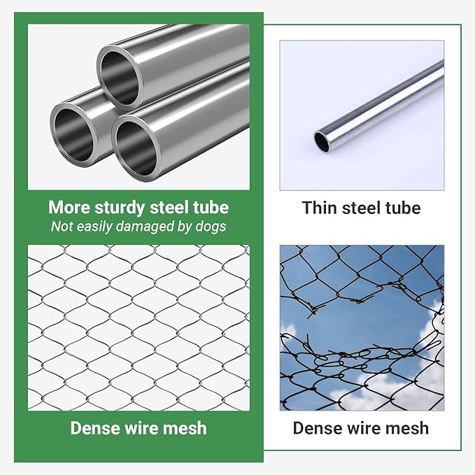 - Lockable Door:This metal outdoor kennel with a lockable door will keep your pets safe from predators and other dangers outdoors. Please note: When installing the fence, please pull it tight enough to make it stronger and avoid gaps.