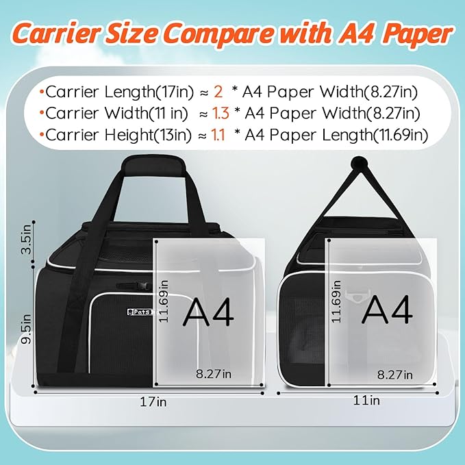 - 【AIRLINE APPROVED CARRIER 】Unfolded size:17"L×11"W×(9.5+3.5)"H, Petskd pet carrier is TSA approved and can be placed under the seat in the cabin(after remove the wheel base), it is mainly designed for ①Alaska Airlines, but also in compliance with ②Southwest Airlines③Delta Airlines④United Airline⑤American airlines⑥Air Canada. We recommend you buy this carrier when you fly with the above-mentioned airlines.