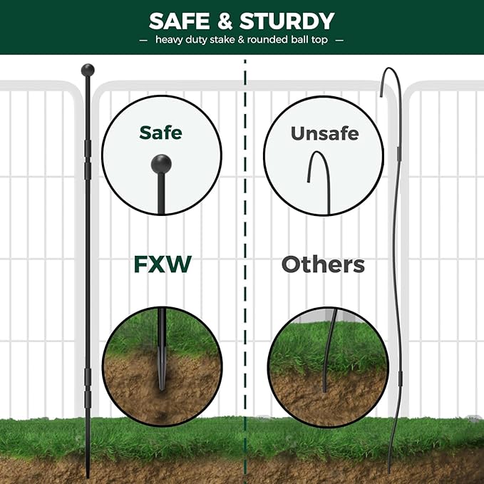 - Safety Precautions: Be aware that when setting up an FXW Rollick/Instant/Aster outdoor fence on a solid surface, the stakes cannot be driven into the ground, leaving gaps between the panels that metal balls cannot fill. This can potentially trap your dog's paws if they jump. Therefore, if your dog is prone to jumping, it is advisable not to use a Rollick/Instant/Aster playpen indoors and consider choosing the HomePlus Series instead.