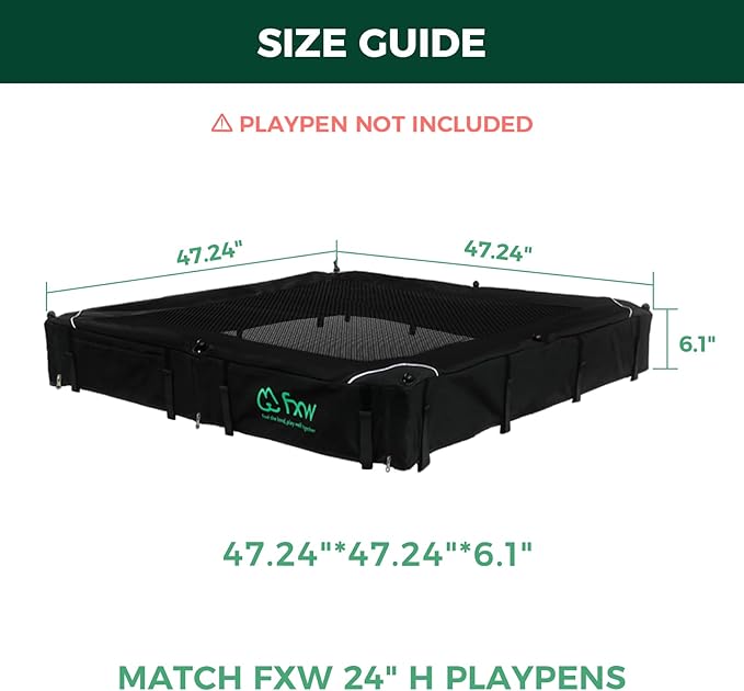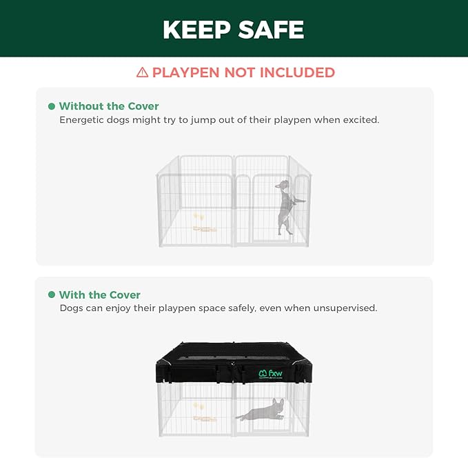 - Tightly Secured: Born from the thoughtful insights of FXW members who sought an extra measure of security, this dog playpen cover aims to address the concern of preventing dogs from jumping out or escaping. Designed to seamlessly integrate with our FXW Heavy-Duty Dog Playpen, this pen cover boasts a fully enclosed structure, reinforced fabric, and 16 hooks & loops for security. It ensures your dog stays safely within their play area.