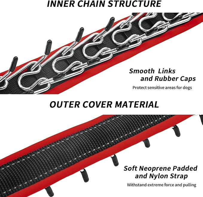 - 🐾【Strong & Durable Material】The inner chain of No Pull Dog Collar is made of stainless steel links, rust-proof and waterproof. Outer cover design with Full Surround Soft Neoprene Padded and Nylon Strap, which can withstand extreme force and pulling power. Combination of two layers adds extra safety to prevent Anti Pull Dog Collar from falling apart, more sturdy and durable.