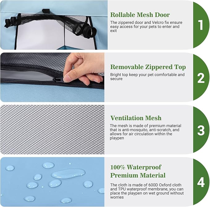 - Waterproof Foldable Pet Playpen: The pop up playpen is waterproof, light weight and folds up, it can be put into a bag for convenient carry and storage. Perfect for travel, camping, picnic, or at the beach