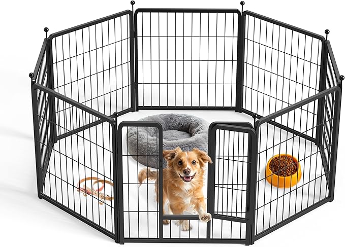 - 【Upgraded Dog Playpen】Dog playpen indoor adopts gravity door lock design, much safer and more convenient. Made of heavy duty metal panels and stakes with black coating, non-toxic, anti-rust. Ensures long time use no matter indoor or outdoor.