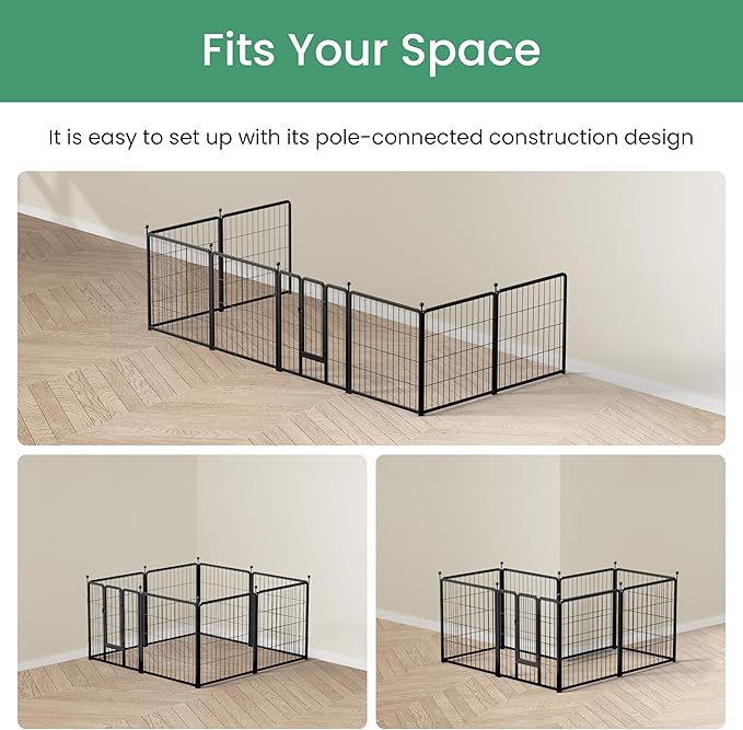 - 【Easy Assemble & DIY Shapes】Each panel is a separate piece. The panels could be assembled in just a few minutes without tools. You could DIY the dog pen to any shape you need, like square, rectangle, round, etc according to your house, garden or lawn.