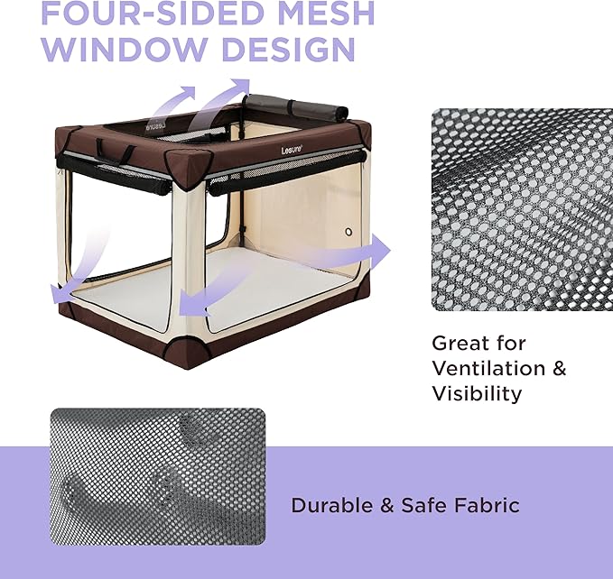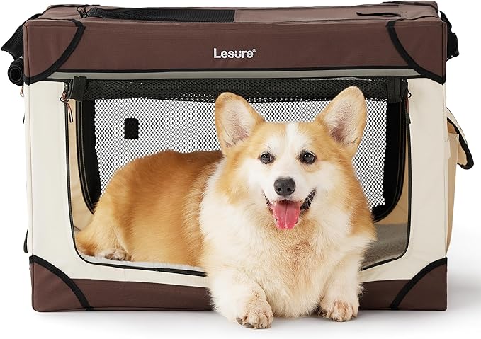 Lesure Soft Collapsible Dog Crate - 26 Inch Portable Travel Crate for Small Dogs Indoor & Outdoor, 4-Door Foldable Pet Kennel with Durable Mesh Windows, Brown