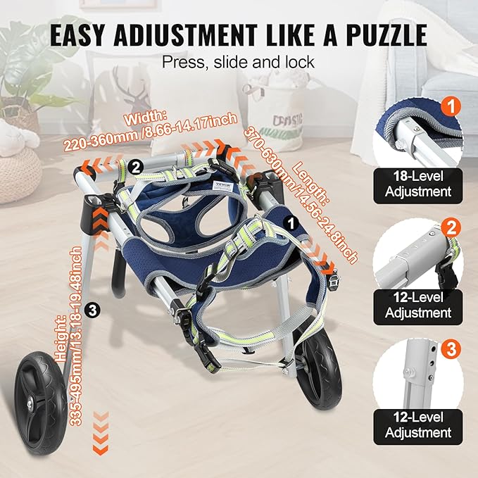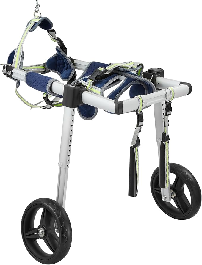- Exclusive Design: The dog wheelchair has an aluminum frame, adjustable straps, EVA wheels, foam leg straps and a 2m/6.56ft dog leash. It's designed to help pets with disabled hind legs move comfortably outdoors.