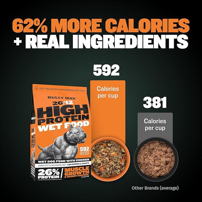 - SHELF-STABLE, COMPLETE NUTRITION: Bully Max dehydrated dog food easily turns into rich wet food with water, perfect for all breeds and sizes. It provides balanced nutrition for healthy growth and shiny coats in both puppies and adult dogs. With greater convenience & longer shelf life than canned wet dog food, Bully Max 26/12 High Protein Wet Food excels over frozen or raw diets, requiring no dry ice, refrigeration, or thawing, ensuring a consistently fresh, protein-rich meal without hassle.