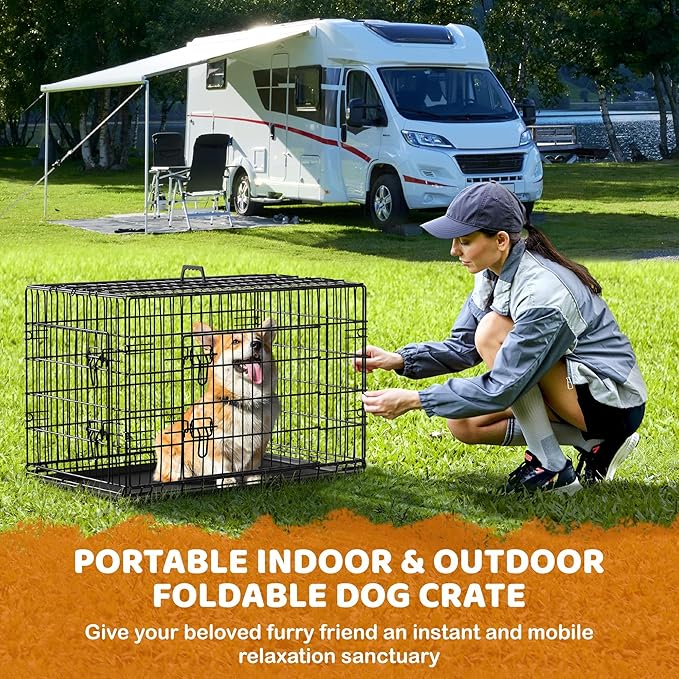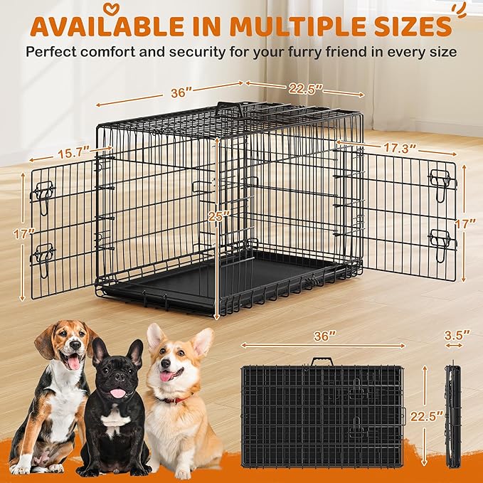 - Portable & Collapsible Dog Crate: With its convenient buckle setup and a detachable handle, this 36″ dog travel crate can be easily folded down to a compact size of 36″ L × 22.5″ W × 3.5″ H. This dog cage is perfect for easy carrying during trips or camping and can be conveniently stored under your bed, sofa, or in tight spaces when not in use