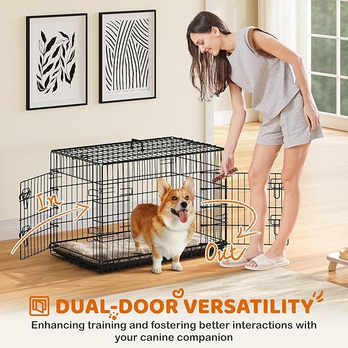 - Robust & Secure: Made from powder-coated metal wires with rounded edges, this black dog crate ensures durability and safety. Its waterproof, pull-out tray simplifies maintenance, and the double-lock design of this double door dog crate furniture keeps your clever escape artist safely inside