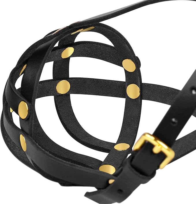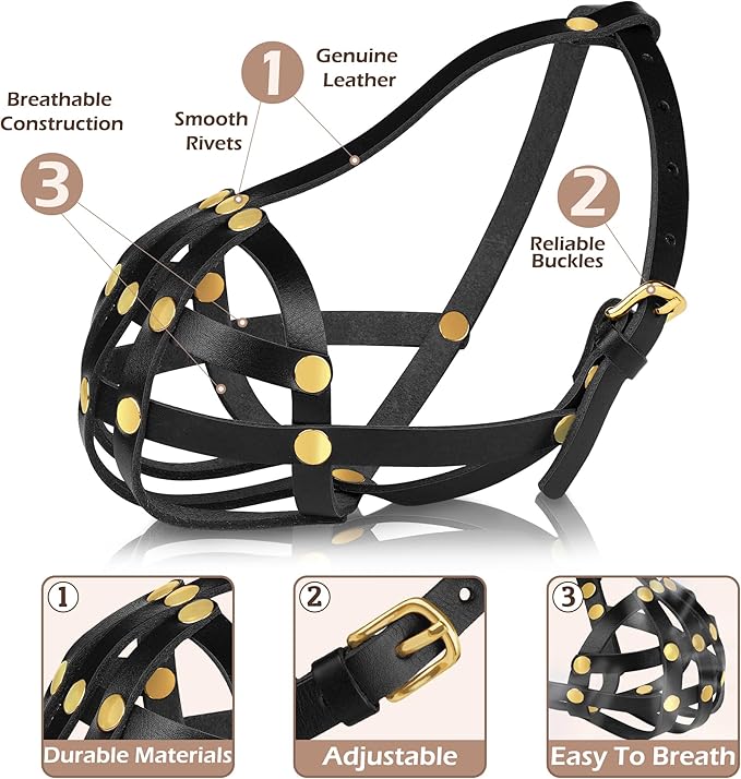 - Materials: Crafted from premium genuine leather with stainless-steel rivets, our cage muzzle ensures safety and durability for small and medium dogs. The adjustable leather straps provide a secure, comfortable fit, preventing slipping during use.