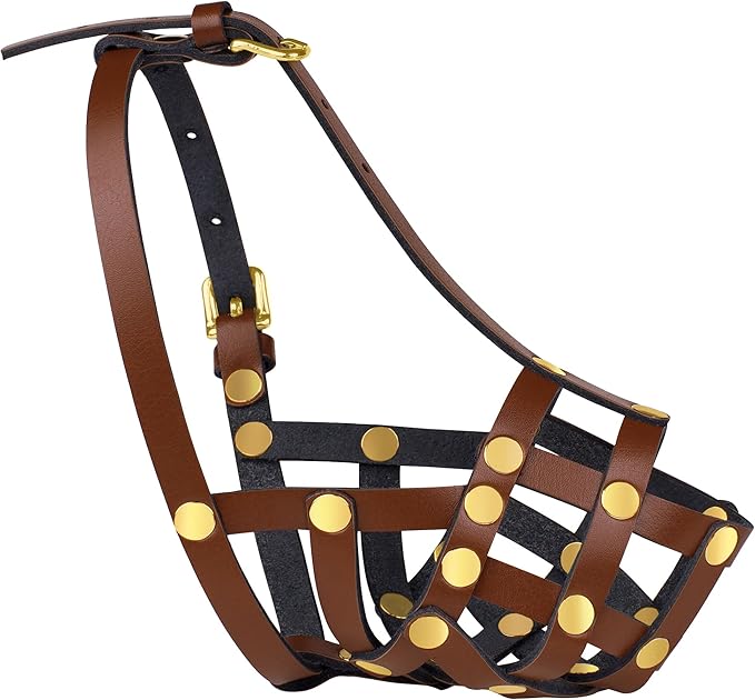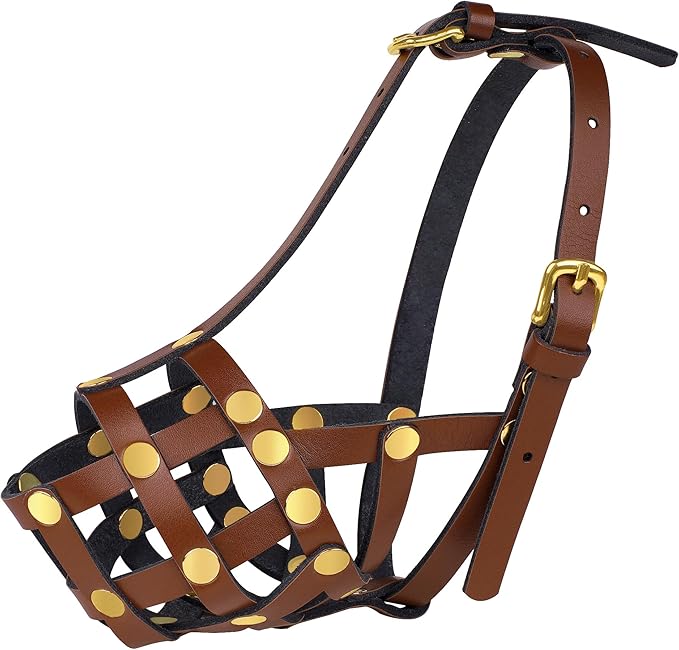 - Materials: Crafted from premium genuine leather with stainless-steel rivets, our cage muzzle ensures safety and durability for small and medium dogs. The adjustable leather straps provide a secure, comfortable fit, preventing slipping during use.