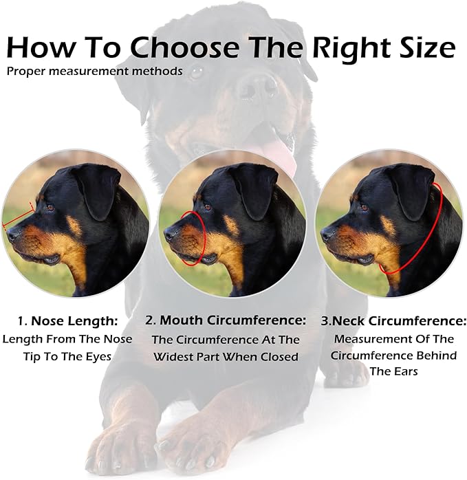 - Rottweiler Muzzle Size: The dog’s snout girth is 13 1/2 inches, and the length is 3 1/2 inches. Please measure both to ensure a proper fit before purchasing.