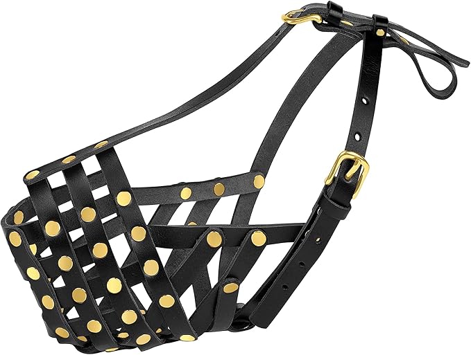 - Materials: Crafted from premium genuine leather with stainless-steel rivets, our cage muzzle ensures safety and durability for large dogs. The adjustable leather straps provide a secure, comfortable fit, preventing slipping during use.