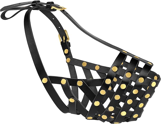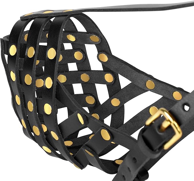 - Materials: Crafted from premium genuine leather with stainless-steel rivets, our cage muzzle ensures safety and durability for large dogs. The adjustable leather straps provide a secure, comfortable fit, preventing slipping during use.