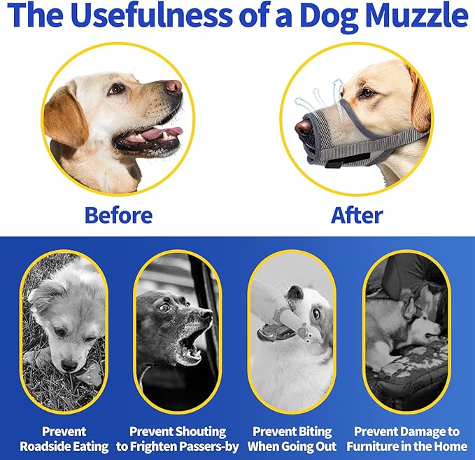- HUMANIZED DOG MOUTH COVER: This dog mouth cover is designed with ultra-breathable mesh to provide good ventilation for panting, and the mesh holes also allow the dog to drink water, can be firmly fitted to the dog's mouth to ensure a perfect fit and ensure safety. There are adjustable straps around the neck and forehead to help hold it in place, preventing the dog's muzzle from falling off. while making it more comfortable to wear