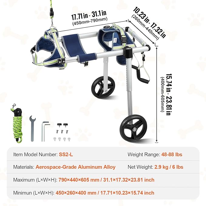 - Exclusive Design: The dog wheelchair has an aluminum frame, adjustable straps, EVA wheels, foam leg straps and a 2m/6.56ft dog leash. It's designed to help pets with disabled hind legs move comfortably outdoors.
