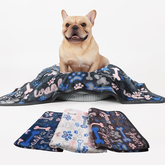 Luciphia 1 Pack 3 Blankets Fluffy Premium Fleece Pet Blanket Flannel Paw Bone Printed Throw for Dog Cat(Small 23"x16", White/Grey/Navy)