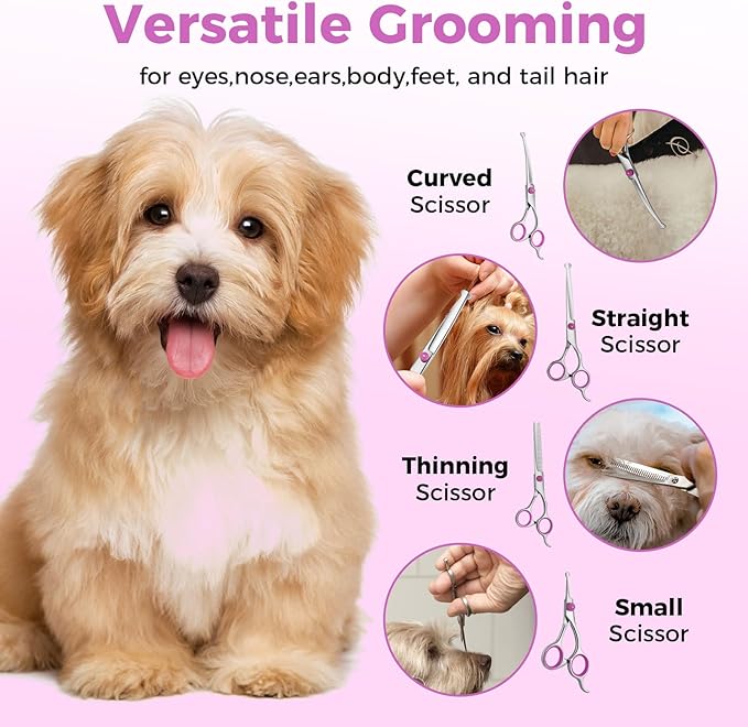 - All-in-One Pink Scissors Set: With 5.1 inch small size pet grooming scissors for small dogs or trimming dog's hair around paws, eyes, ears, face, etc