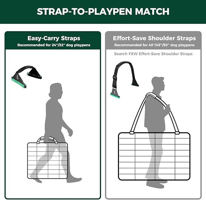 - Holds up to 88 lbs: This Easy-Carry Strap is made of high-density durable polyester material, which is stronger, more durable, and resistant to deformation. Gravity tested up to 40 kg/88 lbs, this is enough to support an 8-panel FXW dog playpen of different heights, such as 24" H/32" H/40" H/45" H/50" H. Note: This value has been achieved under test conditions, and the actual load-bearing capacity may vary due to the use of Hook & Loop.