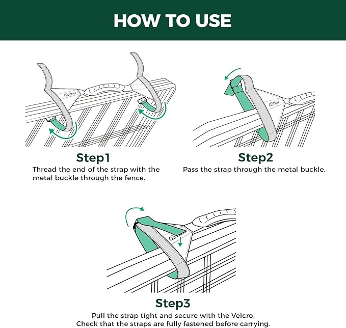 - Portable Handle: Once secured, the ergonomic PVC handle makes it easy to move the fence to the trailer. Note: Check that the straps are fully fastened before carrying. We recommend an initial small lift from the ground to ensure stability before carrying, to protect your feet.