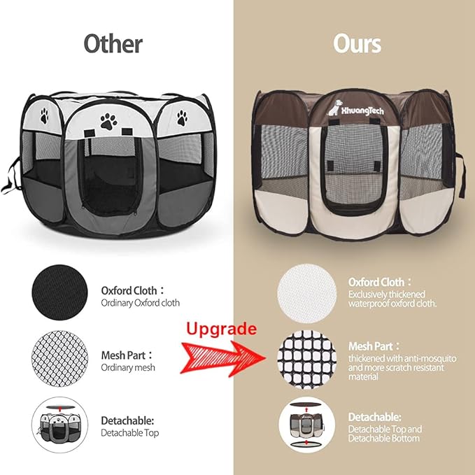 - Upgraded and Optimised: Compared with the old version, our new dog playpens have been upgraded and optimised in many ways. The thickened Oxford and PVC plastic mesh enhances its waterproof, mosquito, scratch and warmth protection of the dog play pen, and adds a removable bottom for easy cleaning.