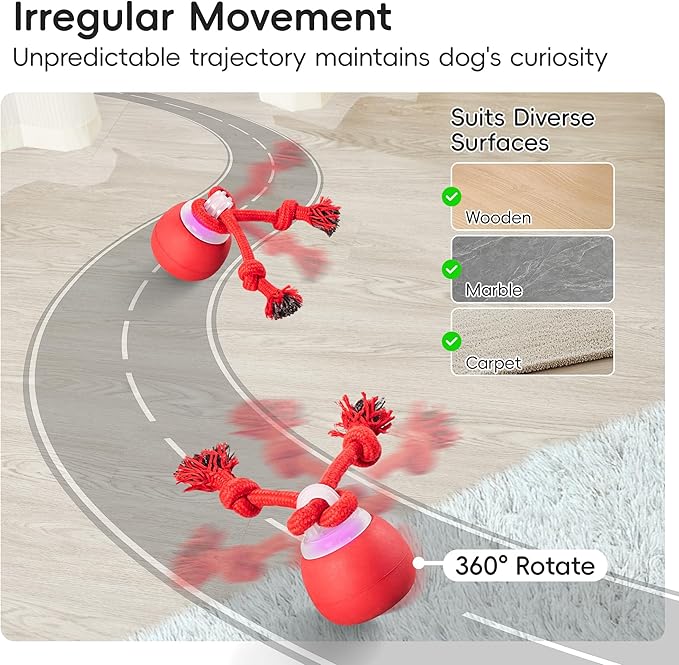 - Interactive Rolling Ball for Active Play – This motorized dog ball toy rolls around with a moving rope attachment, providing an enticing chase that keeps small and medium dogs entertained. Perfect for puppies and chewers, this funny and smart design stimulates their natural hunting instincts, making playtime extra exciting.