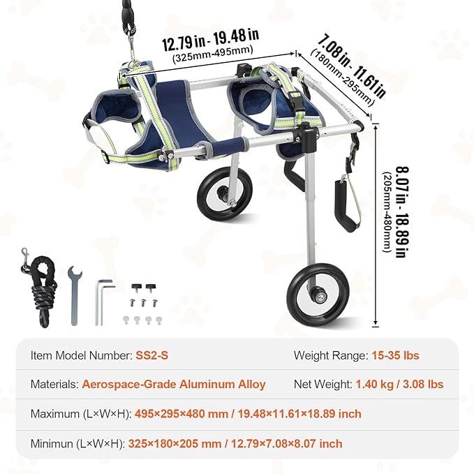 - Exclusive Design: The dog wheelchair has an aluminum frame, adjustable straps, EVA wheels, foam leg straps and a 1.5m/4.92ft dog leash. It's designed to help pets with disabled hind legs move comfortably outdoors.