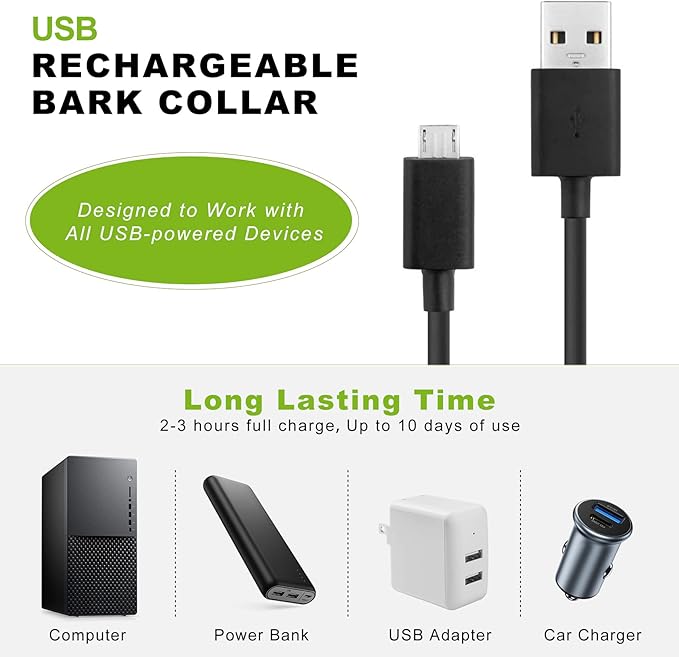 - 【Rechargeable & Waterproof】 This anti barking collar recharge with high capacity battery, fully charges in just 1-2 hours and provides up to 15 days of use. The no bark collar can be charged by phone adapter, USB outlet of the PC/power bank/car. The IP67 waterproof performance allows your dog to wear it in all weather conditions. Note: Swim with automatic bark collar is not suggested.