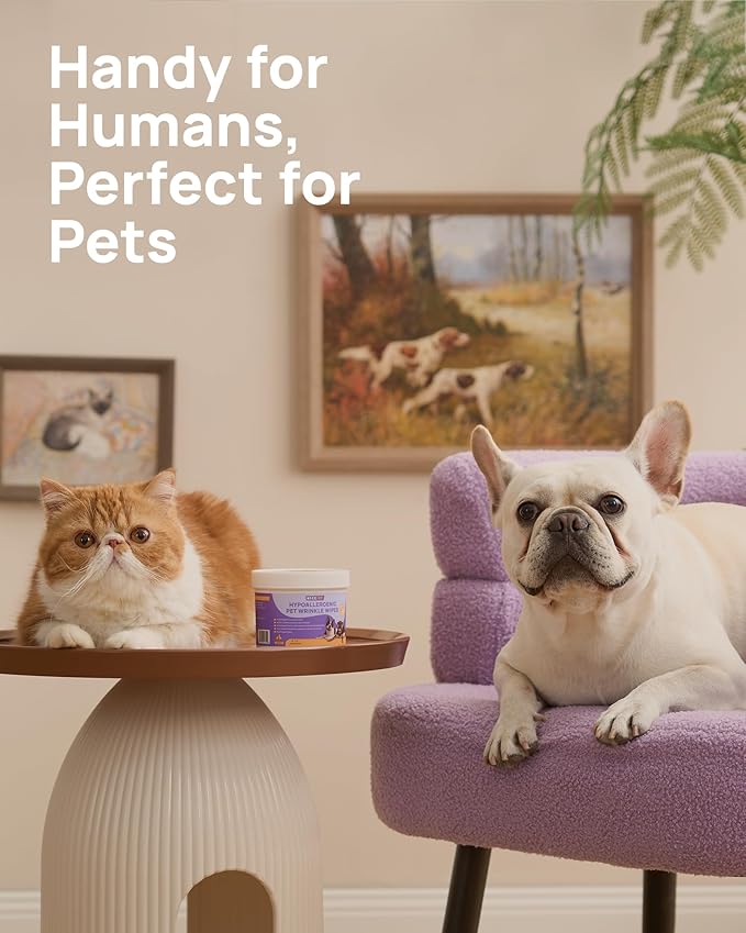 - TARGET DEEP WRINKLE CLEANSING: Specifically designed for brachycephalic breeds, our extra-thick textured dog wrinkle wipes reach deep into facial folds and tail pockets where 73% of skin infections originate. These pet wipes for dogs ensure thorough cleaning of wrinkles and resist tearing, great for Bulldogs, Pugs, and Shar-Peis.