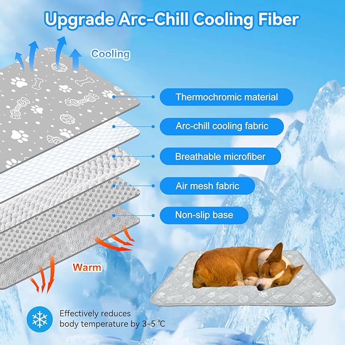 - ❄️UPGRADED SELF-COOLING DOG MAT: Utilizing the latest Arc-Chill self-cooling fabric, our dog cooling mat differs from others mat by requiring no water, electricity, or refrigeration. Simply lay your pet on the cool mat, and it absorbs their body heat, effectively lowering the temperature by 3-5°C (5-9°F). This helps prevent overheating and dehydration, offering a safe and effective way to cool your pet.