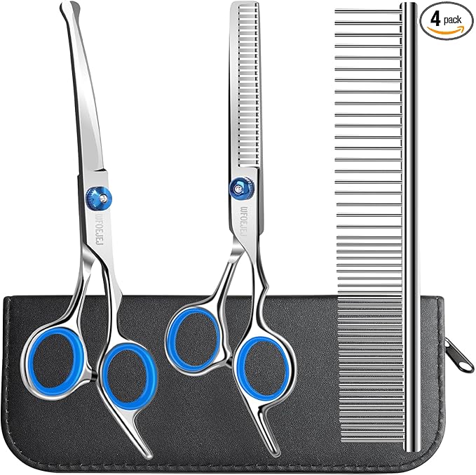 - Complete 4 in 1 Dog Grooming Scissors Kit: Includes 6.5-inch thinning shears, 6.5-inch curved scissors, grooming comb, and a durable storage case—perfect for both home use and professional groomers.