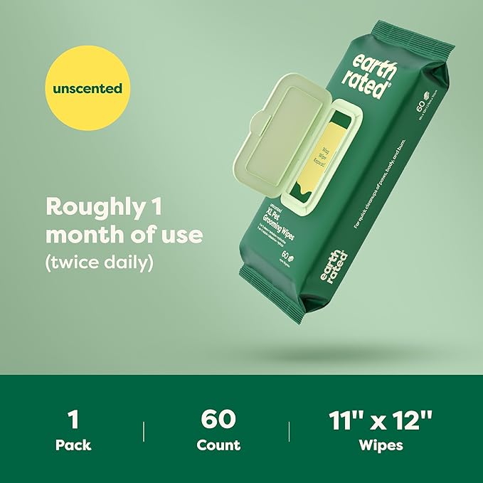 Earth Rated XL Pet Wipes for Dogs & Cats, 3-in-1 Hypoallergenic Cleaning, Deodorizing and Hydrating Extra Large Grooming for Body, Paws and Butt, Unscented, 60 Count
