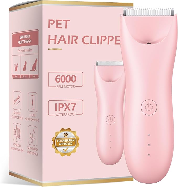 Quiet Dog Hair Clipper,Lightweight 6000RPM Powerful Quick Charged Hair Remover Waterproof Paw Hair Trimmer Kits for Dogs and Cats Pink
