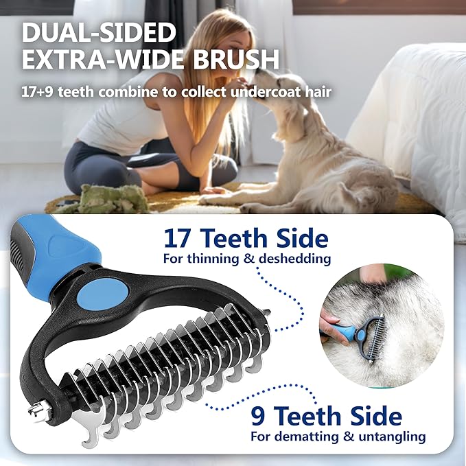 - DUAL BRUSH HEAD DESIGN - Unlike other pet grooming brushes with interchangeable heads, our dog rake features a 2-in-1 brush head design that offers you the same convenience as a single brush head. It has 9 more rounded blades on one side for hair removal and 17 sharp blades on the other side.