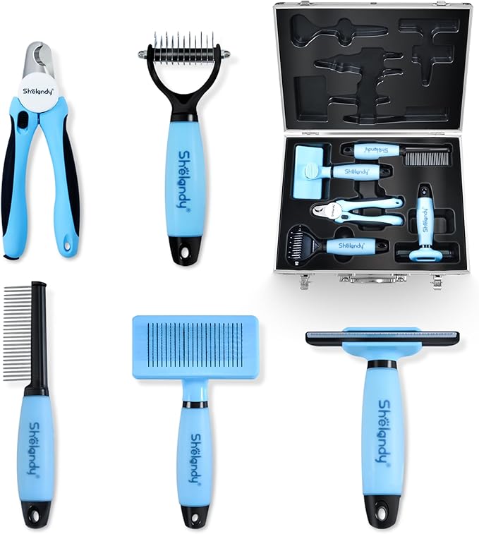 SHELANDY Groomer Partner Pet Grooming Kit, 5-Piece Set with Aluminum Case, Includes Slicker Brush, Undercoat Rake, DeShedding Tool, Flea Comb, Nail Clipper