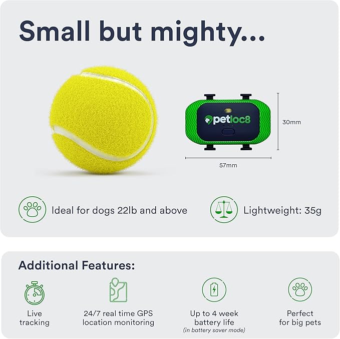- COMFORTABLE, LIGHTWEIGHT DESIGN: As an IP67-rated dust and water-proof tracker, the new PetLoc8 GPS tracker is designed for large and medium-sized pets. It is perfect for all breeds of dogs, with a relaxed and stylish fit that can be attached directly to the collar of your dog