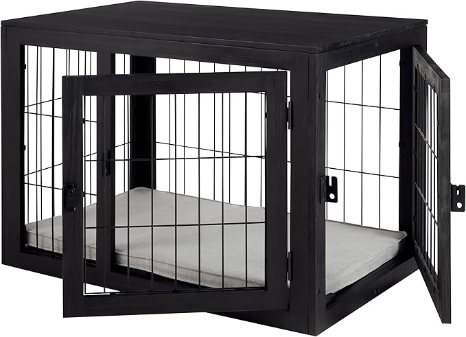 Furniture-Style Dog Crate - Acacia Wood Kennel for Medium Dogs with Double Doors and Cushion - Dog Cage Furniture by PETMAKER (Black)