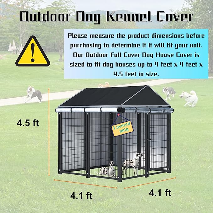 - OUTDOOR DOG KENNEL COVER: Our dog kennel cover measures 4.1'Dx4.1'Wx4.5'H. Fits most brands of dog kennels. The kennel cover is made of 600D durable oxford fabric with waterproof PU coating, which is waterproof, UV and tear resistant, which prevents rust and corrosion of the kennel and protects your investment, the full coverage kennel can provide complete protection for your pet and kennel. (Warm Tip: Only cover is provided, kennel is not included)
