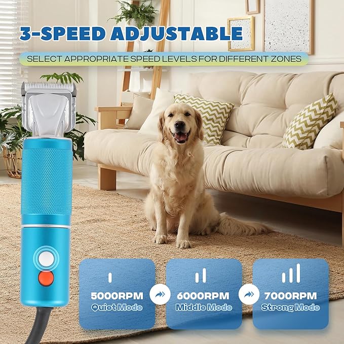 - 5000-7000 RPM 3-SPEED CONTROL - The pet trimmer has an adjustable speed of 5000/6000/7000 rpm, which allows stable operation at any point throughout the speed range using the knob, making it suitable for pet grooming of a wide variety of animals. At the same time, the high speed motor provides strong and long-lasting power for the running blades to trim thick hair without clogging, snagging or pulling, making it ideal for clipping pets of any size and hair thickness.